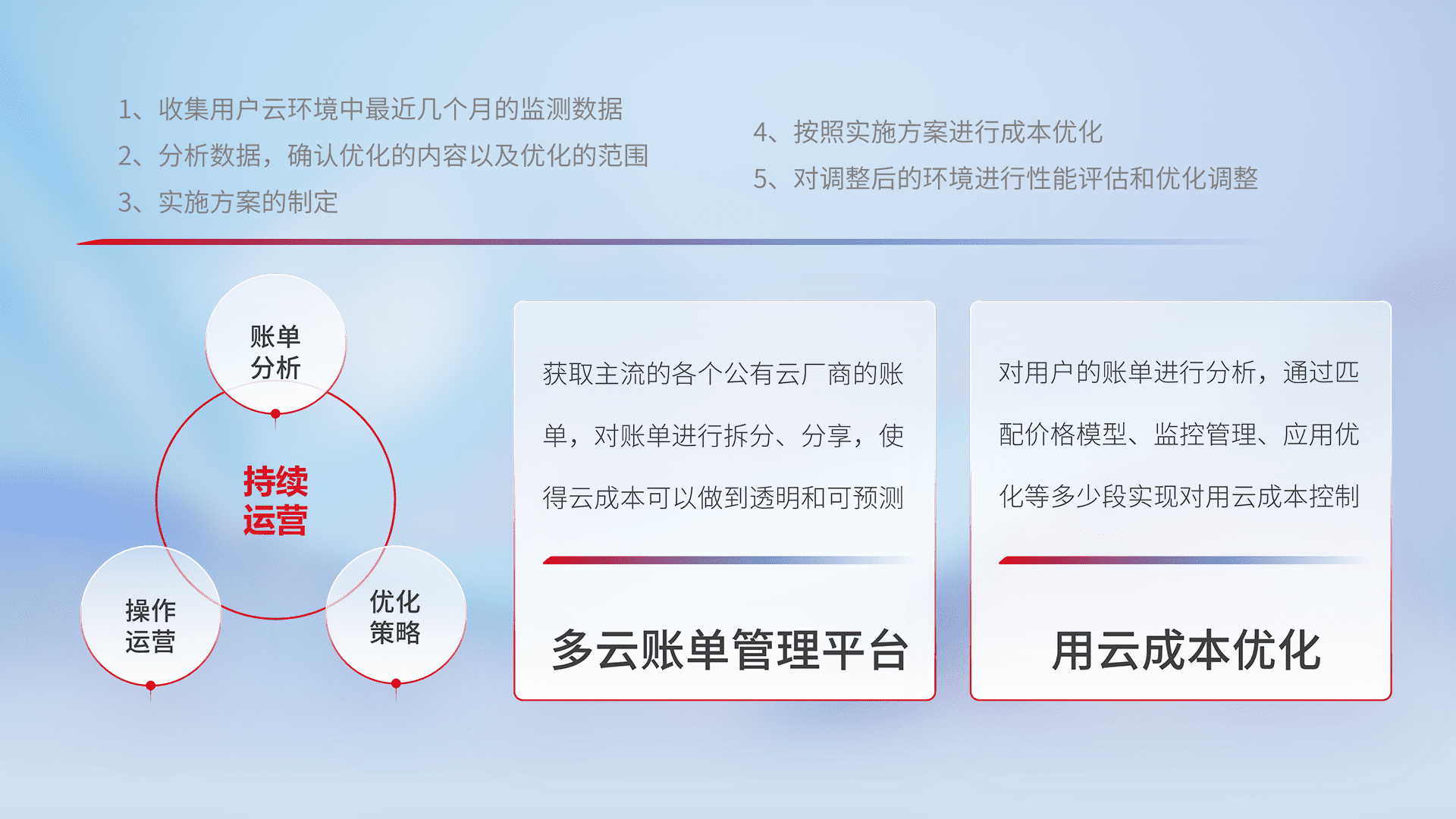 通过多云纳管,,以统一的资源数据模型把客户的云资源进行抽象和封装,,,进而实现对多云资源的统一操作,,,保障云资源管理的可靠性、、、、稳定性与可用性。。。。量身定制化运维内容,,,配置、、、开发运维、、、补丁管理、、、备份、、、、监控、、、认证和访问管理、、、审计和日常巡检等,,,保障在用云过程中的可靠度,,稳定度以及高可用率。。。